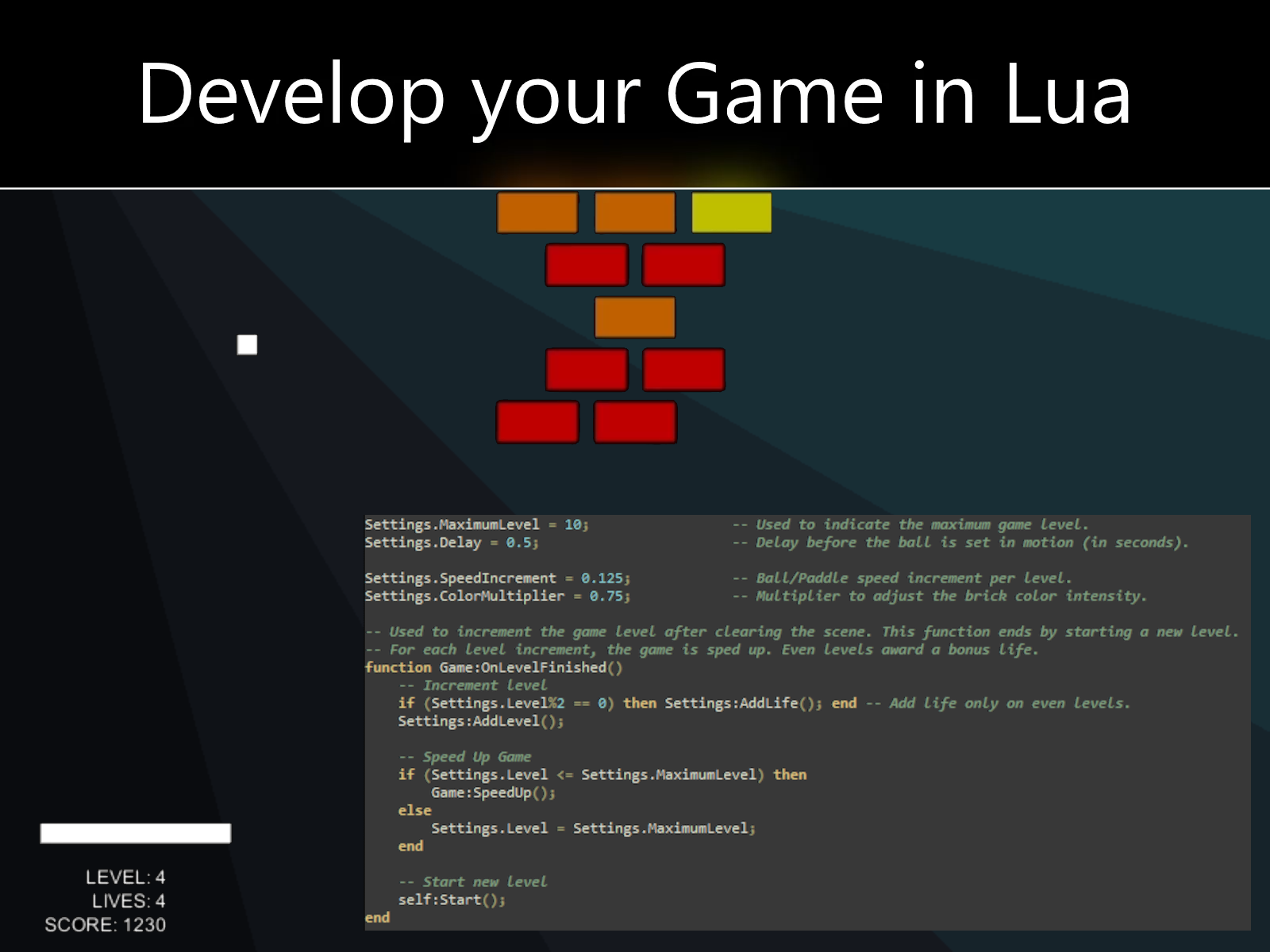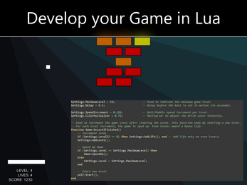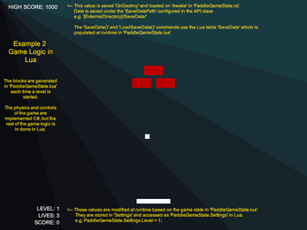 - Lua Sandbox: Expose your game components and data structures to Lua by utilising the base classes provided.