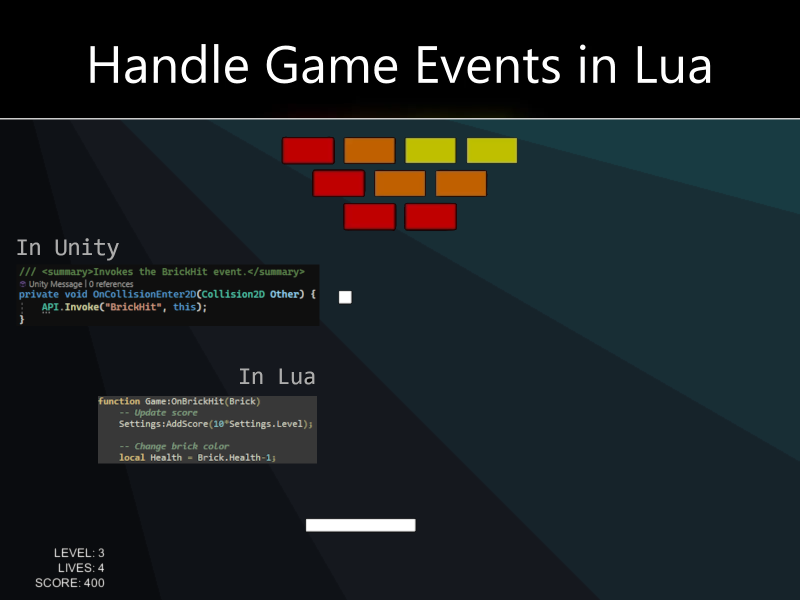 - Event Bus System: Invoke events in C# or Lua and implement the relevant callbacks/handlers in Lua.